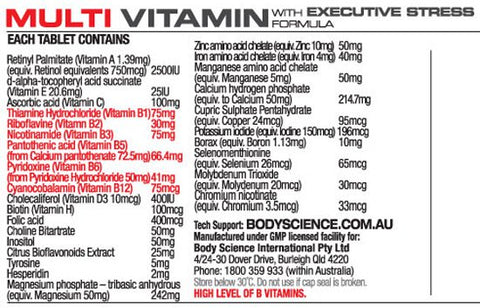 Body Science BSc Multi Vitamin with Executive Stress Formula combines a high potency essential blend of Multivitamins, Antioxidants, Selenium and Folic Acid and minerals.
