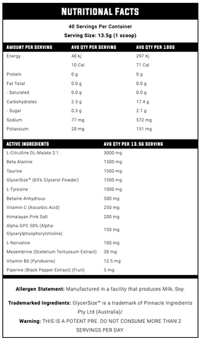 - GlycerSize: Advanced glycerol formulation increases cell absorption, enhancing endurance, muscle fullness, vascularity, and pumps.
