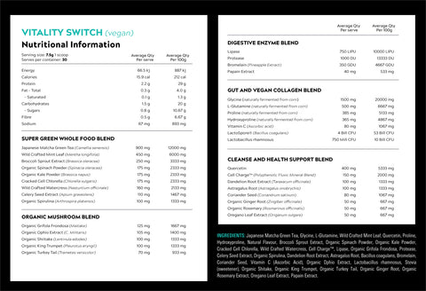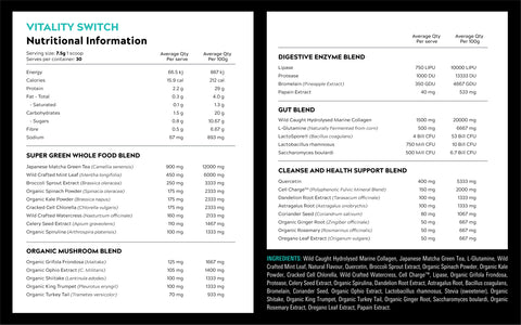 Vitality Switch™ is an ALL IN ONE Revitalising Super Greens Wholefood Powder. The 33 ingredients have been hand-selected to provide you with some of the planet’s healthiest nutrients. It contains 5 amazing blends to optimise your bodys systems.