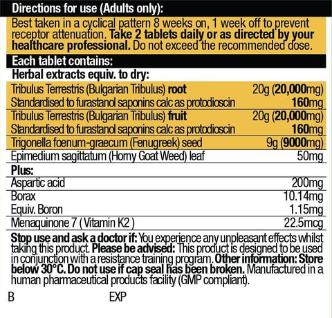 - Tribulus Terrestris fruit and Tribulus Terrestris root - a long history of use in traditional Ayurvedic medicine where it has been used as an aphrodisiac, for healthy male sexual function, to strengthen and enliven the body and to boost energy reserves. Modern scientist research supports its use as an aphrodisiac, it is widely used as an ergogenic aid to improve physical performance in athletes plus clinical research shows it helps increase testosterone levels.